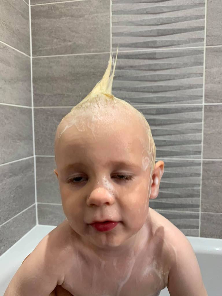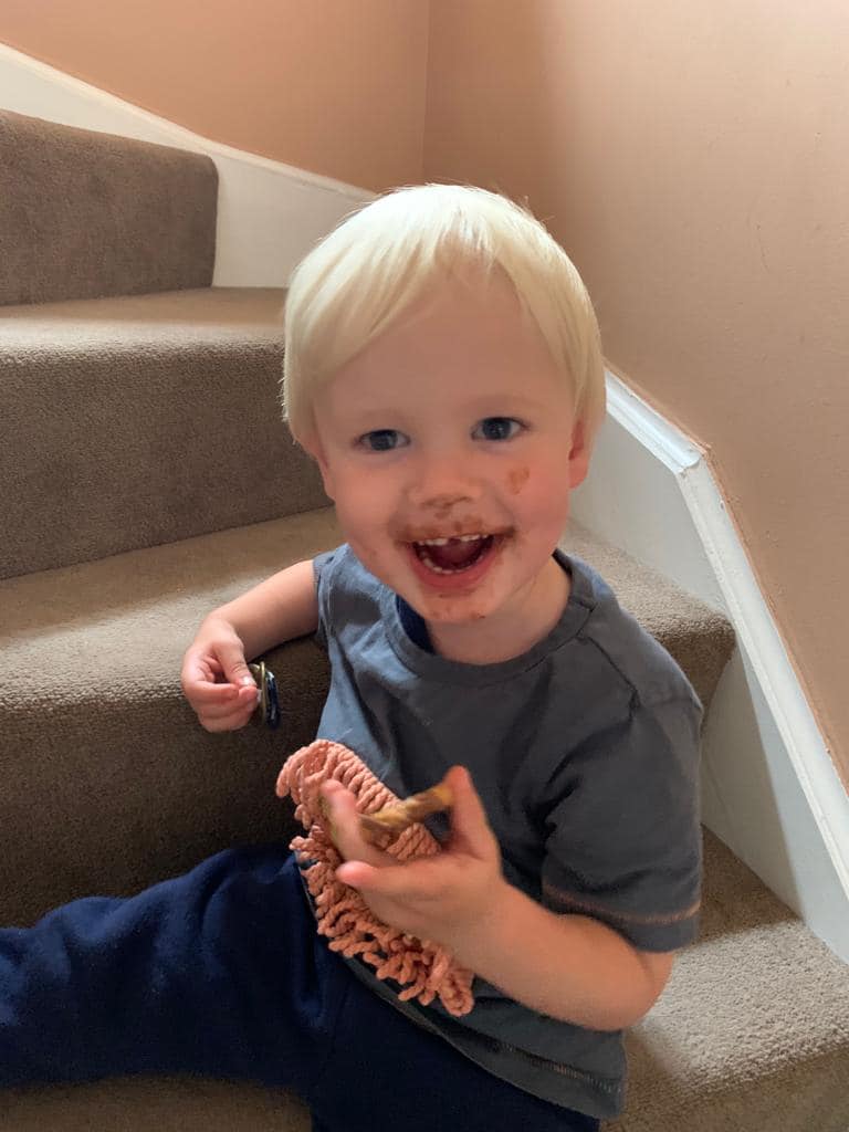 2. M somehow managed to find his way into the garage this morning and locate his box of chalks. Now whilst we have no problem with him creating artwork on the paving slabs outside, bringing them into the house and colouring in the carpet, the couches, his toys and (his pièce de résistance which caused us to come running) his sister’s face was not part of a plan. When he tried to throw himself on my mercy I realised that he’d also coloured his own tshirt in seemed to be spitting blue spittle suggesting he’d been eating or sucking on the blue chalk. That boy just sniffs out trouble and puts his all into the execution. I suppose in a way I should admire his tenacity! 😈